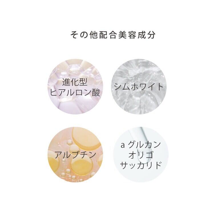 水、BG、アルブチン、 テトラヘキシルデカン酸アスコルビル、 セレブロシド、 グリセリン、 ヒアルロン酸ジメチルシラノール、 加水分解酵母エキス、α-グルカンオリゴサッカリド、フェニルエチルレゾルシノール 、シリカ、ペンチレングリコール、 EDTA-2Na 、 メチルパラベン