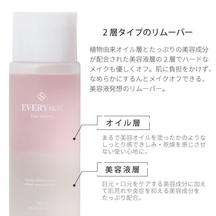 植物由来オイル層とたっぷりの美容成分が配合された美容液層の2層でハードなメイクも優しくオフ。肌に負担をかけず、なめらかにするんとメイクオフできる、美容液発想のリムーバー。